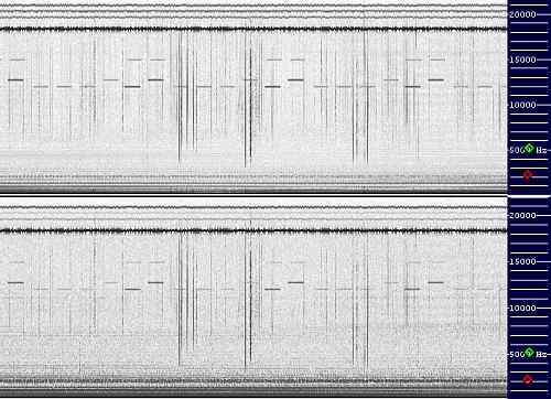 In the part above (received with stylus) many long distance statics (the ones below 1 kHz) appear in the spectrogram. They extend their components down to few Hz. But in the part below (coming from earth dipole) they seem to become more and more weak going down in frequency. The long distance statics have almost disappeared under the 500 Hz. |