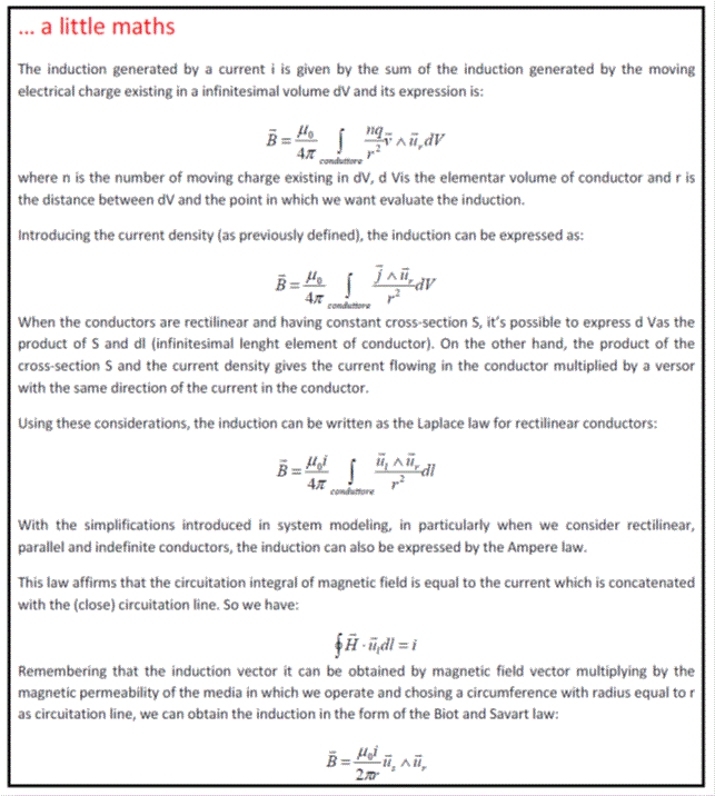 At the basis of the calculation there are considerations of the physical phenomenon related to the production of a magnetic field by an electric current and an interesting analogy between electric field and magnetic field, as reported briefly in the following frame. ![]() Now, with a little math, we can obtain the expression of the induction generated in the space by a rectilinear conductor in which a given electrical current flows, as shown below. ![]()