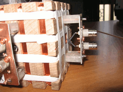 Although the measurement set-up is a triaxial system, we shall describe only one of the three axes, because the other two behave in the same manner. Only the description of the magnetic field probe will be exposed with reference to all three axes, because we must describe also its construction features. 2.1 – Triaxial magnetic field probe For a preliminary design, we started thinking about what we wanted to measure, namely a magnetic field of about a few tens of microtesla at the frequency of 50 Hz and its harmonics. A compact and sufficiently robust probe would have been useful, able to provide, in correspondence of the above values of magnetic field, an open circuit voltage of the order of tens of millivolt. At this regard, the studies reported in [3] and [4] have been very useful and they led us to consider as appropriate, in first approximation, a square loop of about 10 cm side with a thousand of turns. A first sizing gave us this result, using the classical formulas invented in literature (see bibliography [3], [4] e [5]) for multi-layer square windings: ![]() ![]() Reasoning about the reduction of the parasitic