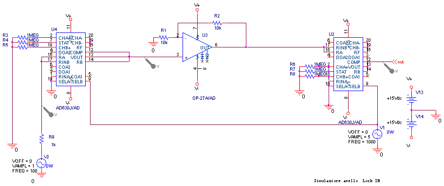 Now we start to simulate by PspiceÒ , all the Lock In ring. We have to add to input signal (Test signal) a white gaussian variable noise source, than modulated by AD630 enlarging by OP27 and demodulate by AD630. We have to vary the test signal amplitude and to verify the correct recovering of the test signal from varied dB of interfering noise.