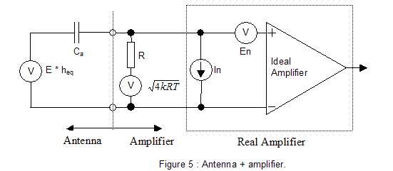 The system shown in figure 5 can be redrawn embedding all the noise sources into a single generator Eeq called “input equivalent field noise”. In such arrangement (see figure 6) E is the signal to receive, Eeq is the noise while the rest of the circuit is noiseless. From the analysis of the circuit of figure 5, it can be proved that Eeq is given by: