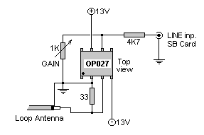 Antenna lay-out and interface circuit to connect big loop to the line input of Sound Blaster card. |