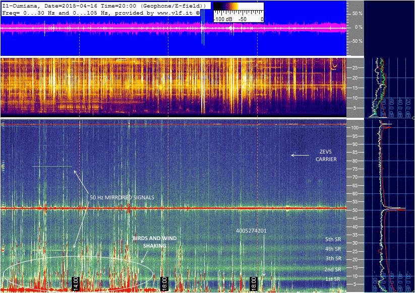 in white oval, power supply noise and Schumann resonances marked on right part. No RF signals correlated