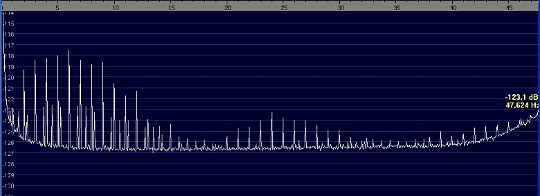 Easy to install, the bus-powered USB 2.0 Sound Blaster X-Fi Surround 5.1 Pro does not require an extra power adapter. Furthermore, this card (in my case: Model no. SB1095) have a ADC (Cirrus Logic CS5345) and a DAC (Cirrus Logic CS4361) which have a dynamic range of 104 dB and work with a sampling rate up to 96kHz/24bit. (Note: the upper sampling rate limit of the ADC (CS5345) and a DAC (CS4361) are 192kHz). For a SDR (Software Defined Radio) application, a quality 24 bit soundcard running at 96kHz or more is recommended, but this will not always mean to spending many money.... Test1 The first test after the installation was the noise performance, one of most important feature of a soundcard for SDR applications: Test conditions: - All analog inputs are unplugged, line input volume is set to maximum - PC: HP XW4400 Workstation, WinXP SP3 - Software: HDSDR V2.1, left input mode, RBW=11,7Hz vertical scale: 1dB/div from -131dB to -114dB - sampling rate 96kHz / 24bit ![]() Many spurious emissions spaced by 1 kHz, maybe from the USB power supply line. The lowest noise level is about -126,5dB at 20kHz Test 2 The second test was the noise performance at very low frequencies near to 0Hz, another important feature for SDR applications: Test conditions: - All analog inputs are unplugged, line input volume is set to maximum - PC: HP XW4400 Workstation, WinXP SP3 - Software: HDSDR V2.1, I/Q input mode, RBW=11,7Hz vertical scale: 1dB/div from -100dB to -129dB - sampling rate 96kHz / 24bit ![]() The center peak level around 0 Hz are about -109 dB, maybe due a low filter capacitor for the ADC internal quiescent reference voltage. The spurious (up to 9 dB above the noise floor) are probably caused by noise on the USB power supply line and can be vary from PC to PC. So i tried to find a solution to reduce these spures. After some tries, i have found the origin of the spurious: The power for the internal analog section (VA) of the ADC. High dynamic range ADC's needs a clean, low noise power supply. Noise & spurious level improvement modification (and improvement of Power Supply Rejection Ratio) (Important note: Any disassembly and/or modify of the unit will void the warranty!) Disassemble the unit: ![]() 1) Remove the pin's to get the 4 screws, as indicate above. 2) Remove carefully the top cover with the knob: ![]() 3) Add a polarized capacitor (1000 uF/ 6,3V) across C100: ![]() Note: Yes, I know that a huge capacitor (1000 uF) cause a high current peak at power on. However, this does not seem to be a problem in this case...;) 4) Add a polarized capacitor (100 uF/ 6,3V) across C40: ![]() Note: This additional capacitor improve the filtering for the ADC internal quiescent reference voltage, to reduce the noise at very low frequencies. Modification results The results after the modification are noticeable: All spures are eliminated and the whole noise level are reduced about by 2,5dB and more (below 2kHz and above 45kHz)! Before modification: ![]() After modification: ![]() Modification results Also the result after the modification to increase the filtering for the ADC internal quiescent reference voltage are noticeable: The center noise peak was reduced by 10dB! Before modification: ![]() After modification: ![]() Test of a Sound Blaster X-Fi Surround 5.1 Pro on a “PMSDR” SDR-receiver Test setup: ![]() To avoid ground loops between sound interface and receiver, i suggest to use a audio galvanic isolator between the sound interface and receiver I/Q-output. Test of a Sound Blaster X-Fi Surround 5.1 Pro on a “PMSDR” SDR-receiver Test setup overview: Test results Test conditions: - Input device:Sound Blaster X-Fi Surround 5.1 Pro, Line input volume is set to maximum - PC: HP XW4400 Workstation, WinXP SP3 - Software: HDSDR V2.1, RBW=11,7Hz sampling rate=96kHz, vertical scale: 5dB/div from -130dB to 0dB Test 1: HP8640B Signal generator out: 7100 kHz, level=-130dBm ![]() Test 2: HP8640B Signal generator out: 7100 kHz, level=-17dBm ![]() Test 3: HP8640B Signal generator ou: 7100 kHz, level=-16dBm The A/D converter input goes to "overloading" or clipping under strong signal conditions: in this case a input level of 1,4Vp. This is the maximum input level if the line input volume is set to maximum: ![]() Test 4: HP8640B Signal generator out: 7100 kHz, level=-130Bm This test was made without the Audio galvanic isolator between the PMSDR I/Q-Output and the Sound Blaster X-Fi Surround 5.1Pro Line-IN. Many spures and noise are present due ground loops: ![]() Conclusions Full scale noise floor after modification: ![]() The modified Sound Blaster X-Fi Surround 5.1 Pro shows a very clean spectrum. The above described results can slightly vary between boards. I recommend to install and use the audio driver from CREATIVE LABS for MS Windows, which offer a better result and permit also to use the virtual audio device “X-Fi Surr 5.1 Pro What U Hear”: This audio device is very useful with digital modes decoding programs (MixW, MTTY, MULTIPSK, Dream) instead of a VAC (Virtual audio cable) to feed the audio output from your soundcard to the input of another software. For my opinion, this sound interface have a very good cost to performance ratio, especially for SDR applications. Furthermore it's also suitable to use with netbooks/notebooks and small to put it in their bags. Return to www.vlf.it index |